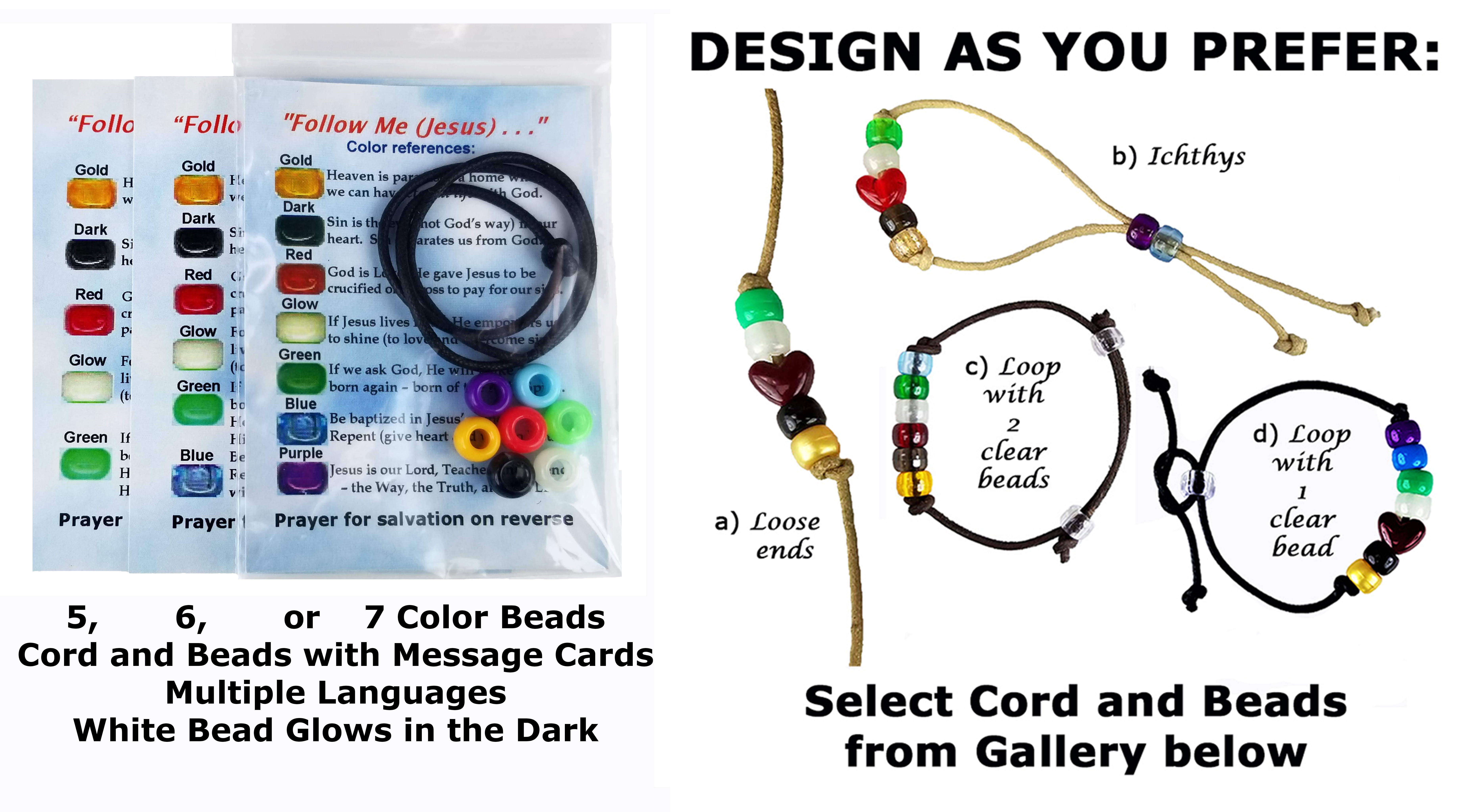 Customize your Salvation Bracelets by clicking on each drop-down menu below (If you don't like making choices, just click "Add to Cart" after 1 - Select Message Card and 2 - Select Cord Preference to have us select Bead Color Combination and Bracelet Design and then change the quantity in the cart):