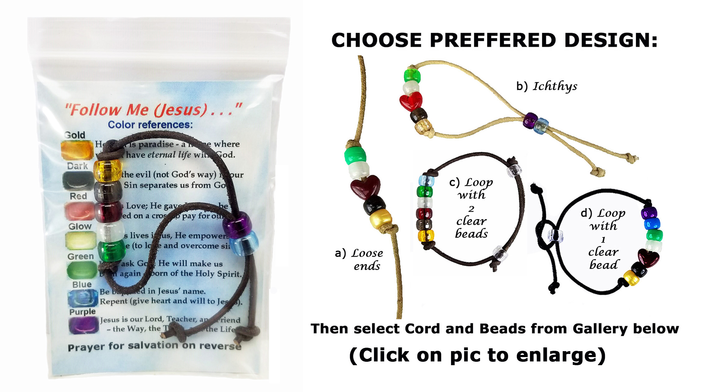 Customize your Salvation Bracelets by clicking on each drop-down menu below (If you don't like making choices, just click "Add to Cart" after 1 - Select Cord Preference and 2 - Select Message Card and Beads to have us select Bead Color Combination and Bracelet Design and then change the quantity in the cart):